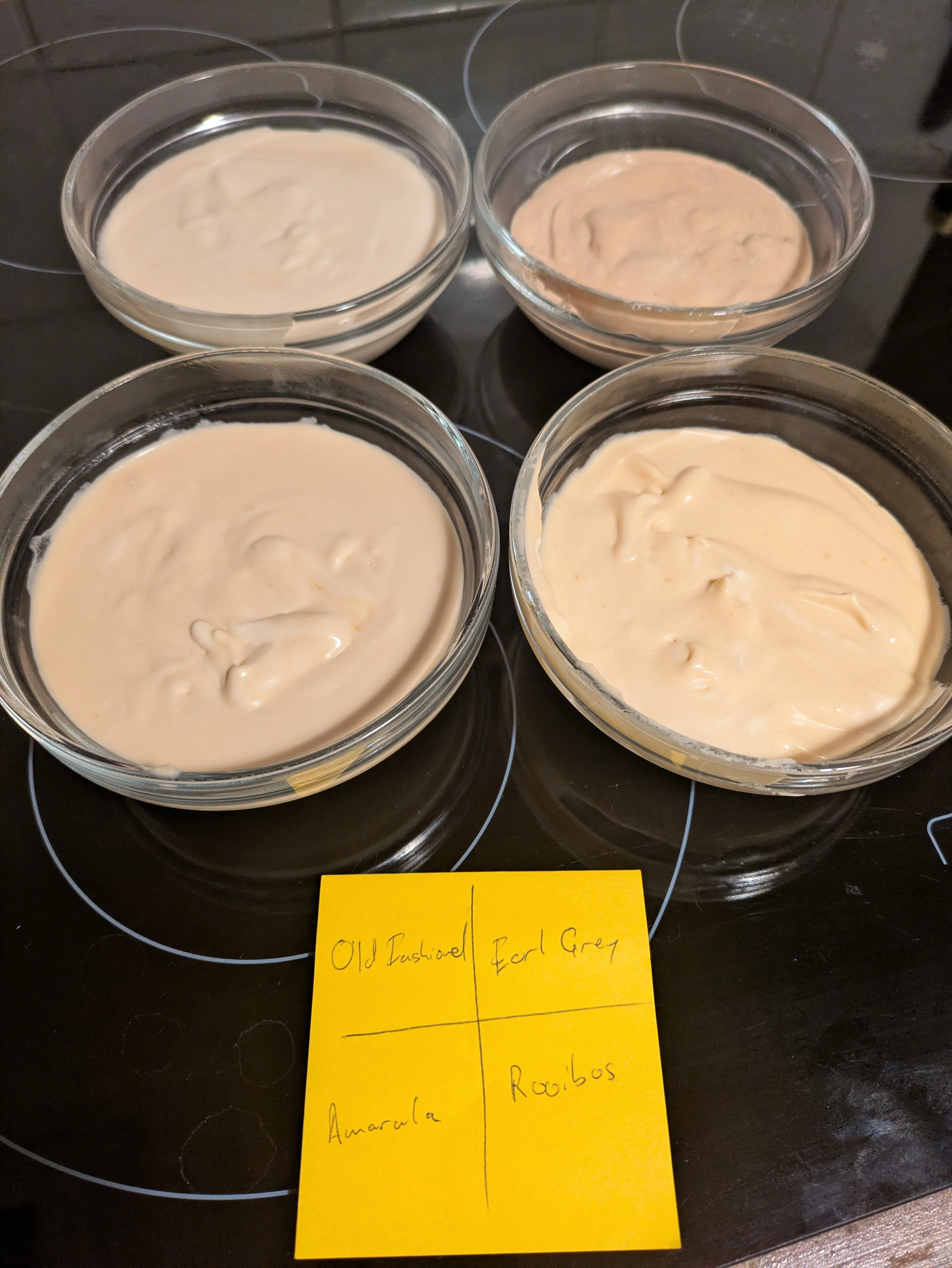 The four flavours I had in mind were: * Bourbon and Bitters (i.e. an old fashioned) * Amarula * Earl Grey Tea * Rooibos Tea